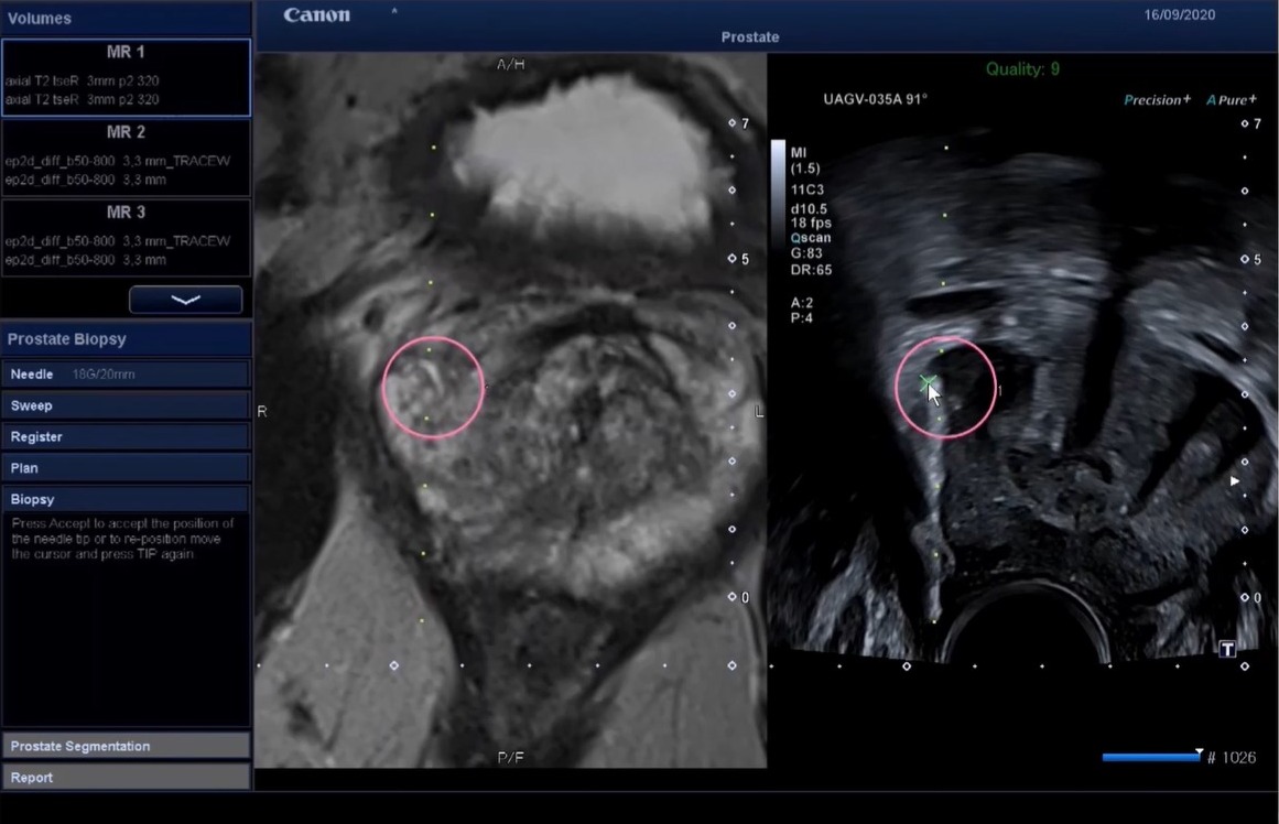 Bei Verdacht auf einen bösartigen Prostatatumor wird im ersten Schritt in einem radiologischen Institut eine MRT-Untersuchung der Prostata durchgeführt. Zeigen sich dort verdächtige Areale, wird im zweiten Schritt durch eine Fusionsbiopsie Prostatagewebe zur feingeweblichen Untersuchung entnommen. Die dabei durch uns angewandte hochmoderne Technik, bei der die MRT-Bilder über die Live-Ultraschallbilder gelegt werden, ermöglicht eine gezielte Entnahme von Gewebe aus dem definierten betroffenen Verdachtsherd.